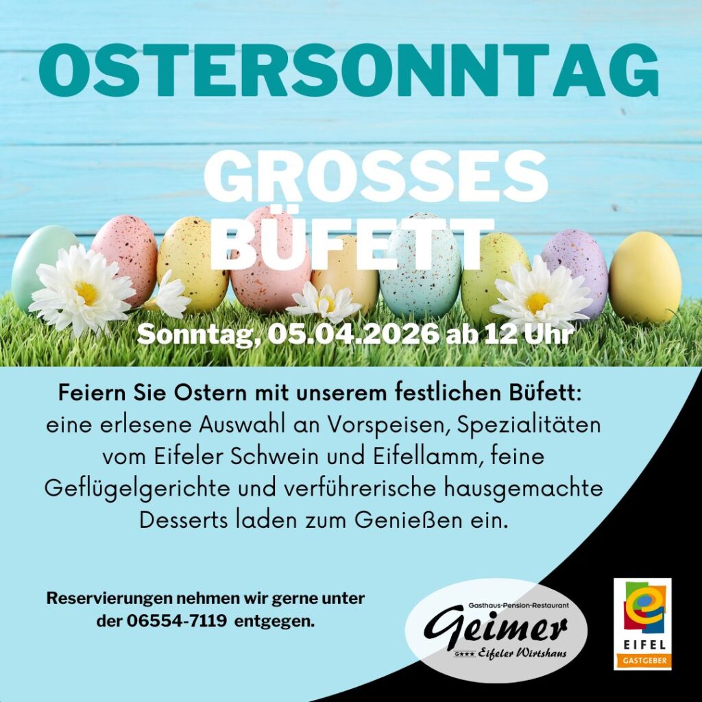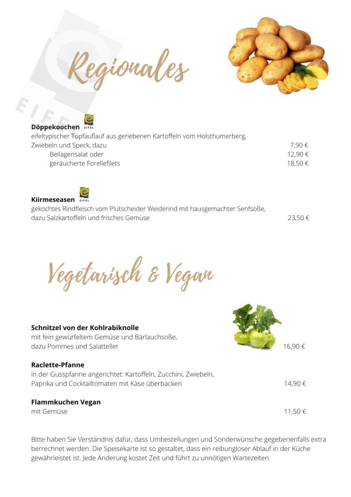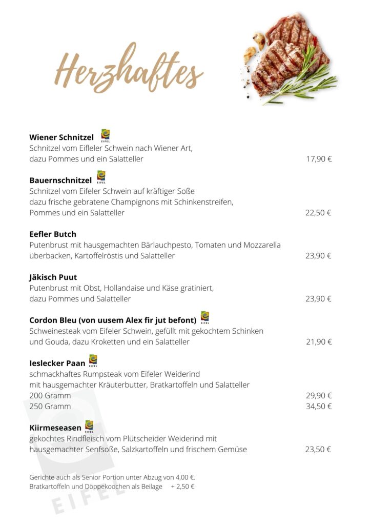 Unsere frische, ideenreiche Küche, bürgt für hochwertige Qualität der Gerichte, da wir vorwiegend heimische sowie Produkte der Regionalmarke Eifel verarbeiten – wie z.B. Käse, Schinken, Rindfleisch von heimischen Bauern, frisches Fleisch von Eifeler Tieren.