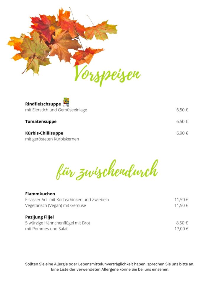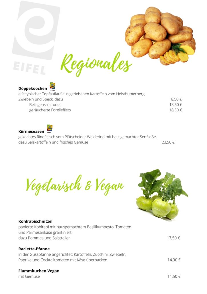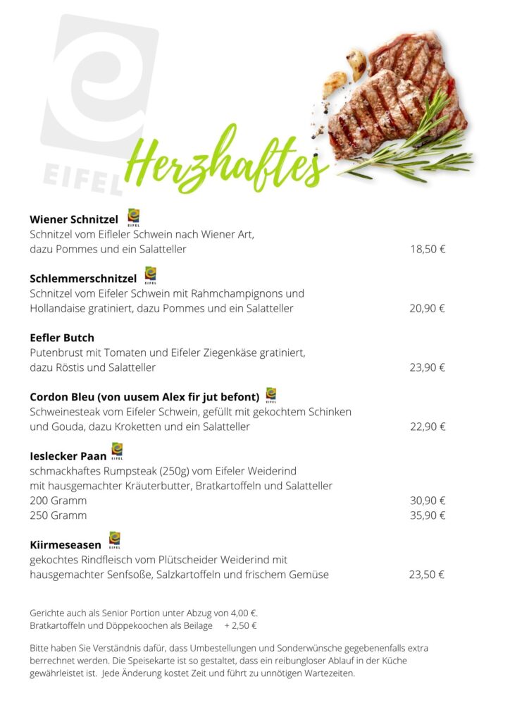 In unserem kleinen Restaurant verwöhnen wir Sie mit Köstlichkeiten der Eifelregion. Unsere frische, ideenreiche Küche, bürgt für hochwertige Qualität der Gerichte, da wir vorwiegend heimische sowie Produkte der Regionalmarke Eifel verarbeiten – wie z.B. Käse, Schinken, Rindfleisch von heimischen Bauern, frisches Fleisch von Eifeler Tieren.